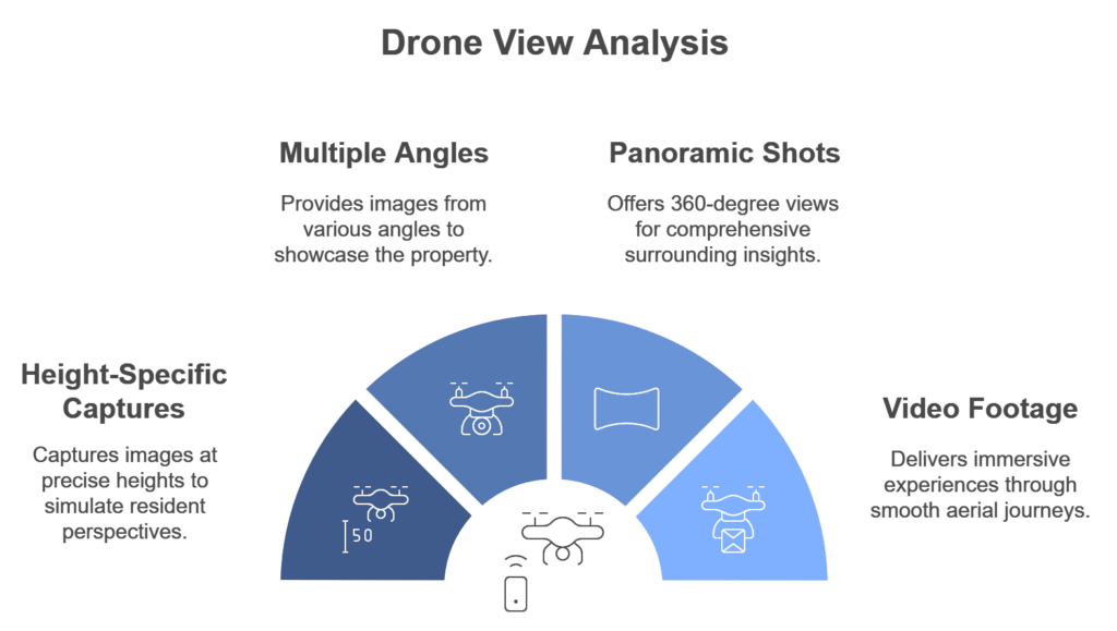 One of the hallmarks of drone view analysis is capturing images at precise heights. The drone ascends to different floor-level altitudes to simulate the perspective residents would have on each level.